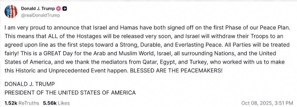 新华社北京10月9日电 美国东部时间8日晚,美国总统在社交媒体上宣布,以色列和巴勒斯坦伊斯兰抵抗运动(哈马斯)同意美国提出的第一阶段“和平计划”。这意味着所有详细的以色列人将很快被释放,以色列军队将离开双方的防线。特朗普的社交媒体截图发布了8月第三天停止加沙的新一轮谈判。以色列、美国、卡塔尔和土耳其的代表当天加入了对话。特朗普8日早些时候曾表示,考虑到谈判“非常接近”达成协议,他可能会在本周末前往中部地区。各党派代表出席8日。以色列领导人会见后,以色列战略事务部长德尔默、美国中东问题特使维特科夫、儿媳库什纳、卡塔尔首相兼外长穆罕默德、土耳其国家情报局局长卡林·奥尔来到沙姆沙伊赫参加对话。埃及总情报局局长拉沙德也参加了当天的会议。 10月4日,人们在耶路撒冷参加游行集会,要求政府迅速在加沙地带实施停火。新华社记者陈俊庆摄 谈判以间接方式进行,埃及、卡塔尔和美国担任斡旋。据埃及开罗新闻电视台报道,当天双方举行了双边和多边沟通,并举行了扩大会议。不过,哈马斯没有参加扩大会议。特朗普在圆桌会议上对媒体表示白宫8 -8 -ups表示,谈判“进展顺利”,是达成协议的“好机会”。他可能于11日或12日启程前往中东。巴勒斯坦消息人士当天称,巴勒斯坦伊斯兰圣战组织(Jihad)和解放巴勒斯坦民众阵线(PFLP)的代表计划于8日晚抵达埃及。他们将与哈马斯代表团一起参加谈判,这可能对解决加沙以色列被拘留者问题更有用。自2023年10月新一轮巴以冲突爆发以来,圣战组织和人阵就参与了针对以色列的行动。圣战组织承认一些以色列工作人员也被限制,但没有提供更多细节。据以色列媒体报道,哈马斯和巴勒斯坦两派目前关押着48名以色列人,以色列认为其中20人还活着。以色列“积极”及各方“乐观”媒体进行报道8日早些时候,援引以色列官员和消息人士的话称,加沙地带新一轮谈判停止了“积极”迹象,预计调解人将达成停火协议并解除协议。 《以色列时报》8月-8日报道,援引一位熟悉谈判进展的消息人士和一名阿拉伯外交官的话说,以色列和哈马斯的调解人组织9日达成协议,其中哈马斯将立即释放被拘留者的幸存者,以换取停火。停火的实施将使哈马斯能够收集已故被拘留者的遗体并将其交给以色列。哈马斯老成员塔希尔·努努萨的媒体顾问当天,哈马斯和以色列交换了待释放人员名单。参赞指出,哈马斯代表团表现出了热情和责任感,使谈判取得了必要的进展,并最终达成了协议。调解员努力消除障碍停火协议达成,各方对此“充满乐观”。据以色列12频道电视台报道,以色列已经开始起草停火协议提案,该提案将提交给内阁以供掌声。报道援引多位以色列官员的话说,根据签署的协议,在哈马斯释放所有被关押者并交出所有可能找到的遗体后,以色列将开始释放巴勒斯坦囚犯。哈马斯提供了 20 名被拘留者幸存者的信息,并仍在寻找一些死亡被拘留者的遗体。报道称,以色列不会在2023年10月7日释放直接参与袭击以色列的巴勒斯坦武装人员,不过,如果释放部分终身监禁的主要巴勒斯坦囚犯,以色列将采取一定的“灵活性”。以色列拒绝从之前的停火协议中释放其中的许多人。预计双方都会感到无聊到最后一刻。 (记者:赵卫红,姚兵、陈俊庆、王卓伦、吴宝树)(责任编辑:朱晓航)